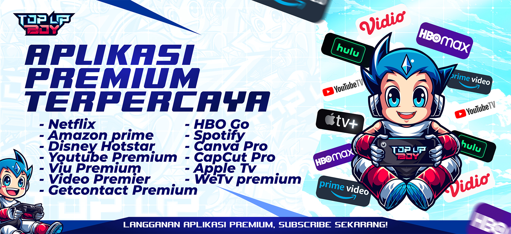 Tidak hanya itu, kami juga menyediakan ragam paket isi ulang aplikasi premium untuk berbagai platform. Jadi buat kamu yang kerap nonton lewat TV kabel atau membuat konten desain dan edit video, kamu bisa membeli layanan premium di platform kami. Beberapa platform yang kami layani misalnya Netflix, Capcut Pro, Canva Pro, Webtoon sampai Spotify. Kini kamu tidak usah pusing membeli aplikasi premium di platform lain karena Top Up Boy menyediakan semuanya. Apa lagi dengan harga yang bersaing.