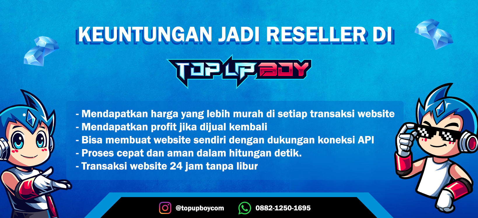 Buat kamu yang ingin menambah penghasilan, Top Up Boy juga membuka peluang untuk kamu yang ingin jadi reseller. Transaksi pun sangat mudah. Bahkan kamu bisa menentukan sendiri keuntungan yang ingin kamu dapatkan dengan menjadi reseller kami. Keuntungan jadi reseller di tempat kami adalah: